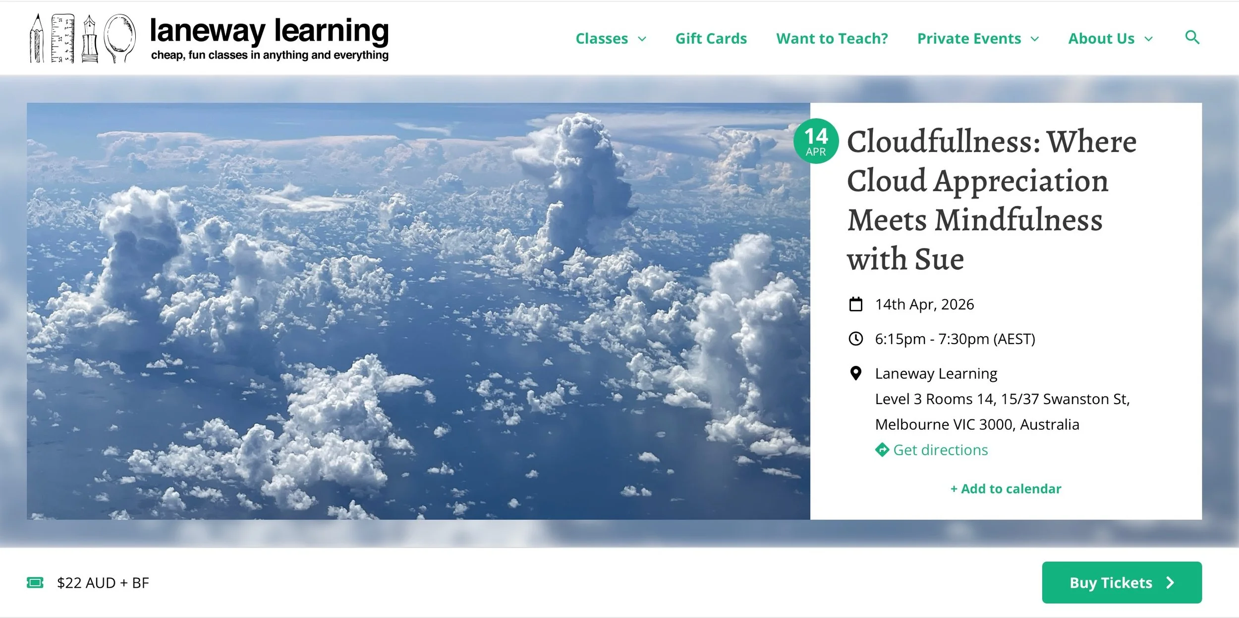Could your organisation benefit from some blue sky thinking? Encouraging people to look up at clouds and rekindle their imagination is what Sue does best. For workshops and speaking engagements please contact Sue at:[email protected]Upcoming workshop at Laneway Learning: